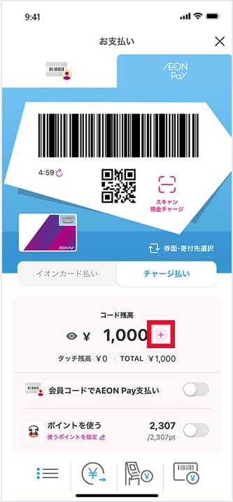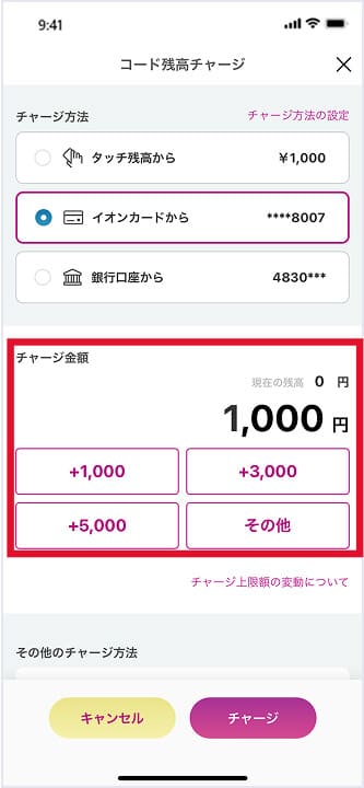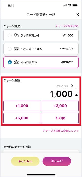 AEON Payの残高チャージ画面でチャージ金額を設定します。