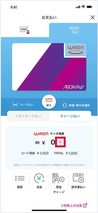 チャージ方法の一つとして、コード残高とWAONタッチ残高を移行する機能があります。