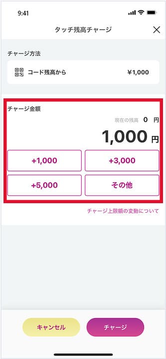 移行先の決済画面を開き、チャージを選択して、残高移行を行います。