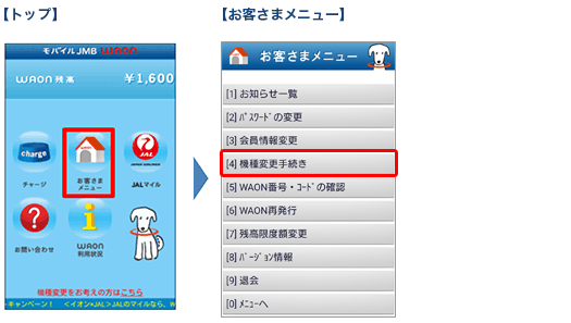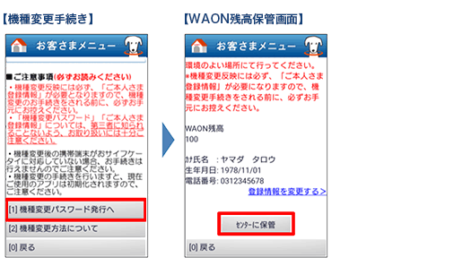 携帯電話の機種変更を行う場合は、モバイルJMB WAONをご利用のお客さまがWAON残高を引き継ぐのに以下のお手続きが必要となります。