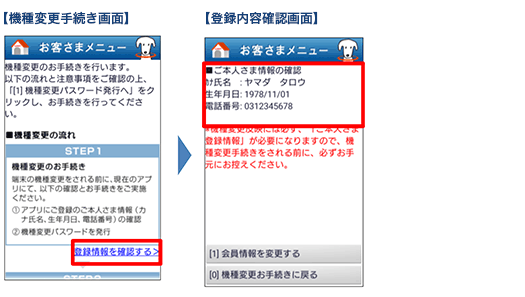 - 2.機種変更後の新しい端末との認証の際に「ご本人さま情報」が必要となります。【機種変更手続き】画面の「登録情報を確認する」をクリックすると、機種変更お手続きに必要な「ご本人さま情報」が表示されます。新しい端末へ変更する前に必ず内容を確認し、お手元にお控えください。