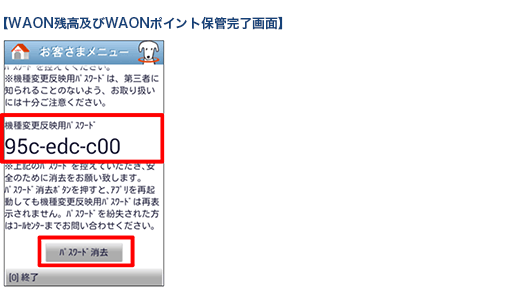 - 4.手順3のWAON残高及びWAONポイントの保管が完了いたしますと、機種変更反映用パスワードが表示されます。機種変更反映用パスワードは新しい端末での認証に必要になります。また、再発行はされませんので、必ずお手元にお控えください。パスワードをお控え後、「パスワード消去」ボタンをクリックし、アプリを終了いたします。
