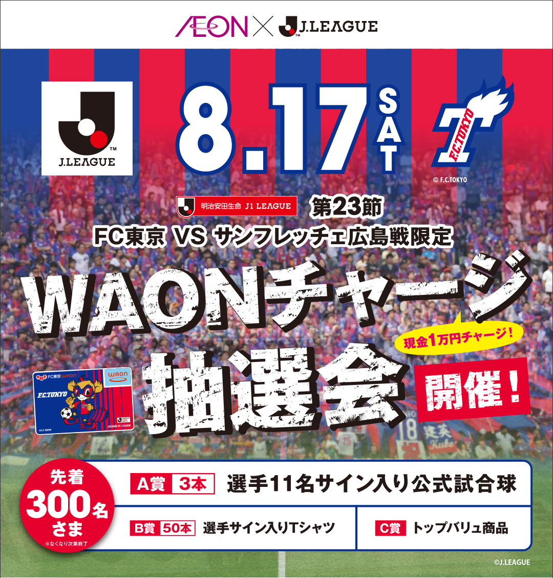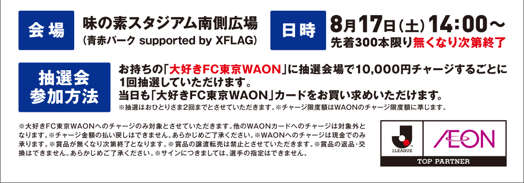 - ※2森重真人選手、髙萩洋次郎選手、ディエゴ オリヴェイラ選手、東慶悟選手、永井謙佑選手、ナ サンホ選手、橋本拳人選手、小川諒也選手、渡辺剛選手、大森晃太郎選手いずれか1名のサイン入りTシャツです。(選手は選べません)