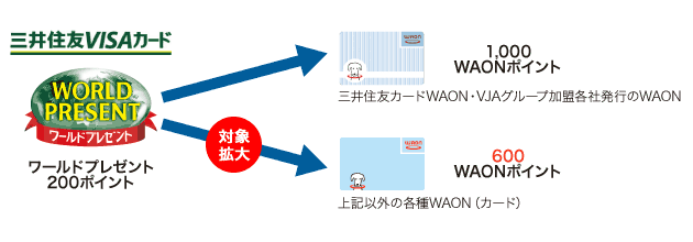 三井住友カード ワールドプレゼントの交換は、三井住友カードWAON・VJAグループ加盟各社発行のWAONに限られていましたが、各種WAON(カード)への交換が可能となりました。(交換レートは異なります)
