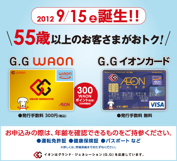 2012年9月15日(土)より、イオンのお店にて55歳以上のお客さまにおトクな「G.G WAON」「G.Gイオンカード」の販売、申込受付を開始します。