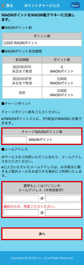 チャージWAONポイント数にチャージポイント数を入力します。
