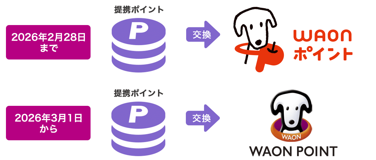 2026年2月28日をもちまして、提携先ポイントの「WAONポイント」への交換は終了とさせていただきました。