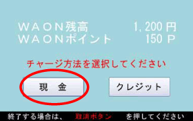 訂正する場合は、【取消】ボタンを押します。すると、WAONカードかざし画面に戻り、現金が返金されますので、最初から操作のやり直しをします。