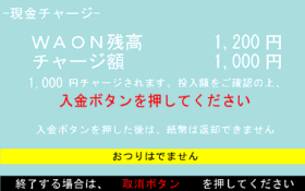 1,000円札を1枚投入し、【入金】ボタンを押すことを3回繰り返すことによりチャージすることができます。