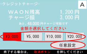 2.左のAの画面が表示されますので、チャージする金額を選択してタッチします。