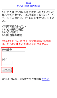 2.「WAON番号(半角数字/16桁)」、「コード(半角数字/6桁)」を入力し、「ログイン」を選択します。