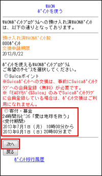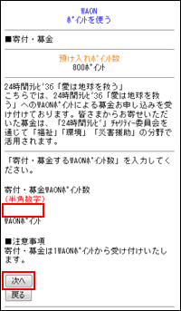5.「寄付・募金WAONポイント数(半角数字)」を入力し、「次へ」を選択します。